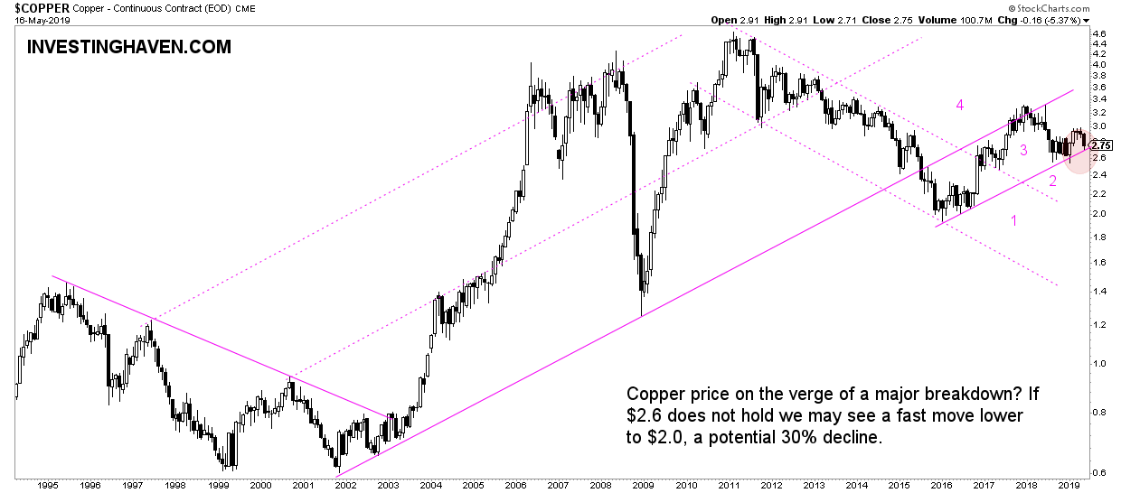 The price of copper (COPPER) is testing support. As per our copper forecast 2019 we said the copper market does not look bad, but it certainly does not qualify as a market that will make it into the TOP 3 Investing Opportunities Of 2019. A fall below current price levels, with 3 consecutive weekly closes and 3 consecutive monthly closes below $2.7 will confirm a breakdown, qualifying for a juicy short opportunity.