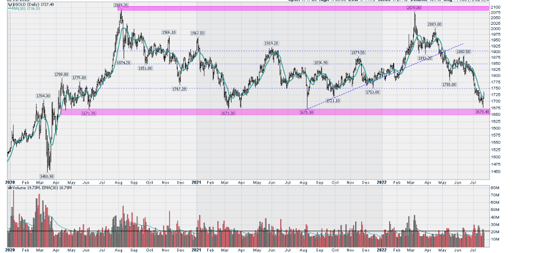 Trading sessions in the month of July were painful to watch for commodities and precious metals investors. The Gold chart is showing a continuous decline after the price was rejected at $1850 mid-June. Just to make things worse for the nervous gold investors out there, we are heading this week into an FOMC meeting. So as the bearish headlines are flourishing on financial media, we want to take a moment and get grounded by the charts that matter (as opposed to news articles which are a lagging indicator). This should provide us and our readers with a clear perspective as to where gold is heading depending on key price levels. Similarly, we try to address the question whether our gold forecast 2023 is still in play or got invalidated?