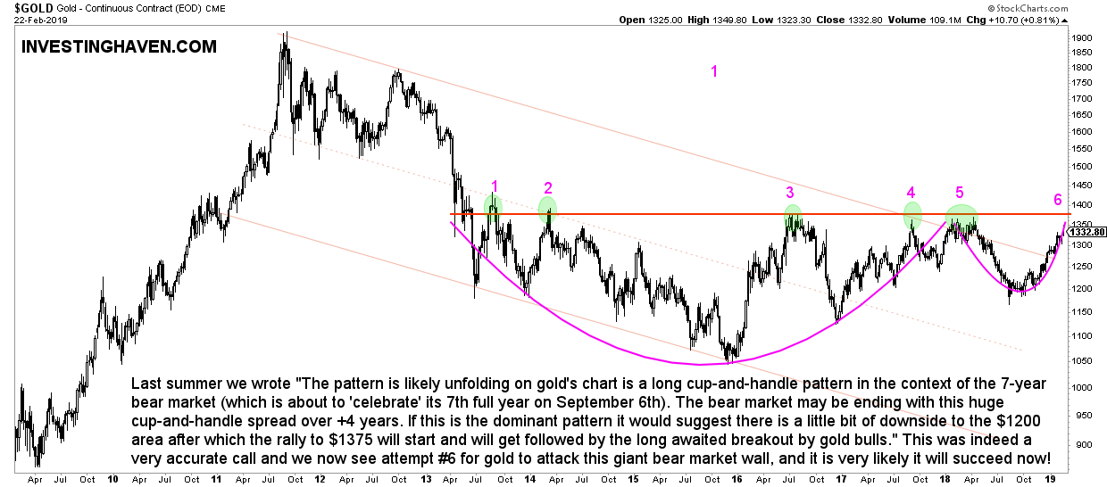Last summer we wrote “The pattern is likely unfolding on gold’s chart is a long cup-and-handle pattern in the context of the 7-year bear market (which is about to ‘celebrate’ its 7th full year on September 6th). The bear market may be ending with this huge cup-and-handle spread over +4 years. If this is the dominant pattern it would suggest there is a little bit of downside to the $1200 area after which the rally to $1375 will start and will get followed by the long awaited breakout by gold bulls.”