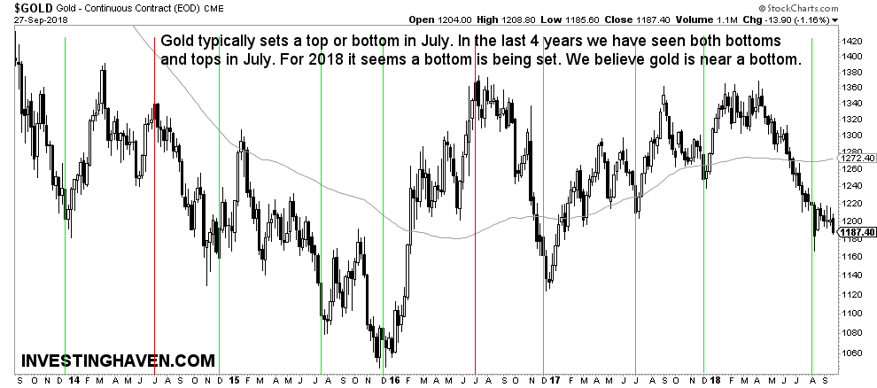 Investors should never exclude the flipside of any story. Although the gold chart shows a rounding formation since May of this year, not seen in the last 5 years on below chart, it can always go the opposite direction in a sudden way. It is not a matter of being fearful all the time, but a matter of understanding when an assumed direction or pattern gets invalidated. For gold, we are close to invalidating the rounding bottom, so the next 2 to 3 weeks are crucial.