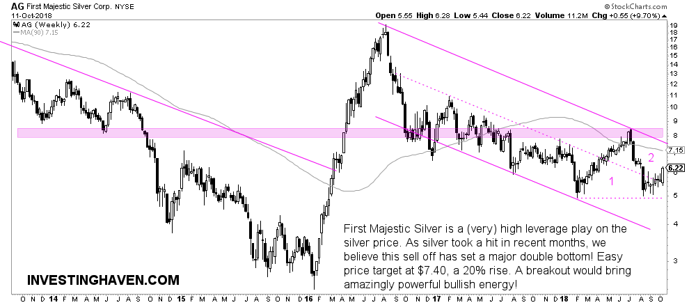 The bellwether pure play silver stock shows a very bullish setup, similar to the price of gold shown above. First Majestic Silver, the largest silver pure play miner, sets a major double bottom against January of this year.