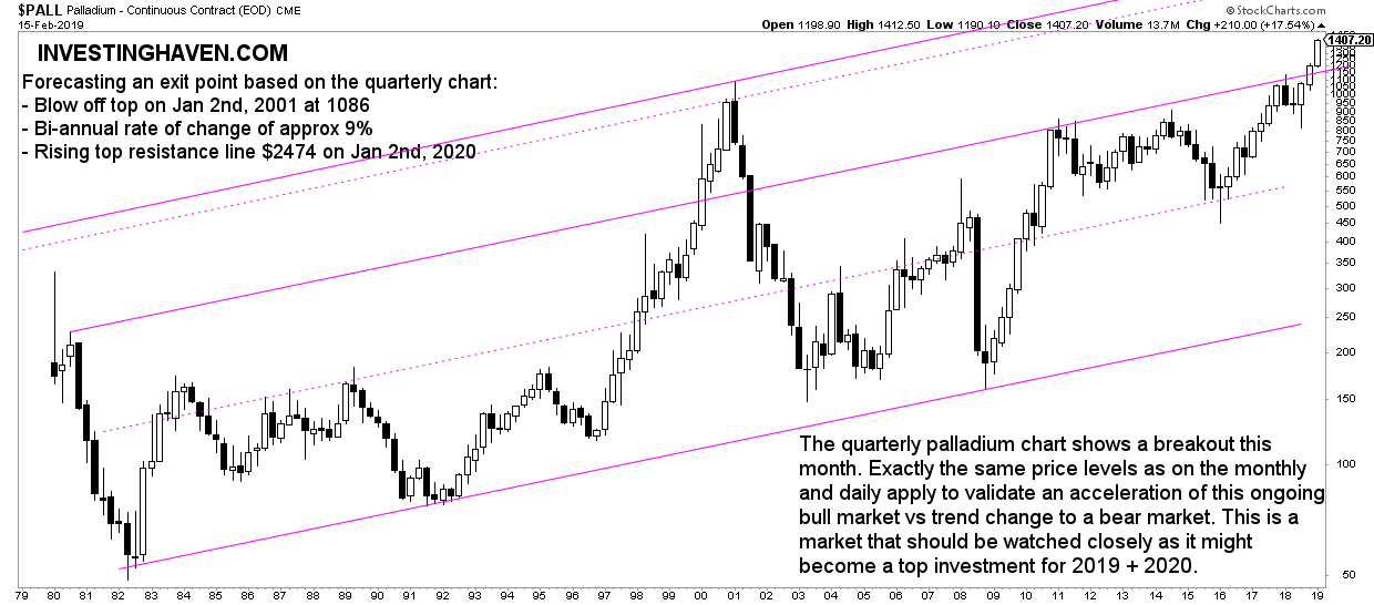 The chart makes our point. The short term timeframe shows an amazingly juicy setup, and as said if palladium trades above $1420 it is transitioning from the lower band to the upper band in its secular rising channel. It would bring palladium much higher! How high? We can see that on the higher timeframe, see 2nd chart.