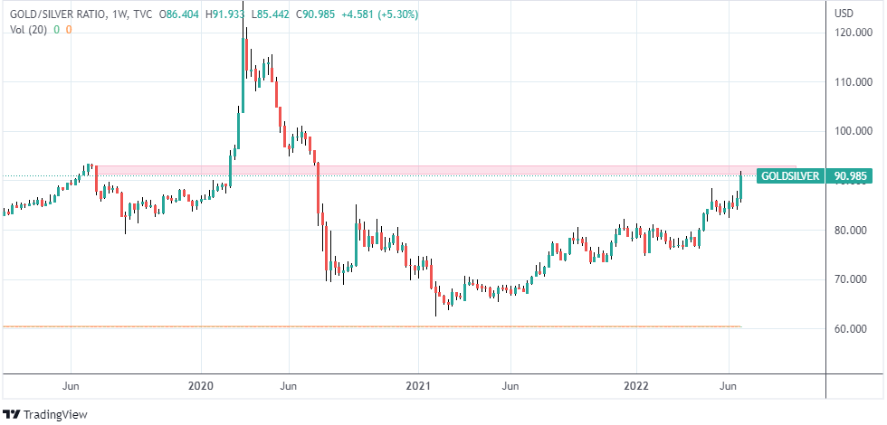 Which one will outperform is not necessarily the insight we are looking for here. However, we do notice that the ratio is hitting a resistance area. This might indicate a possible upwards move for Silver, therefore corroborating the findings mentioned above: That Silver is in a support area and that the support is likely to hold.