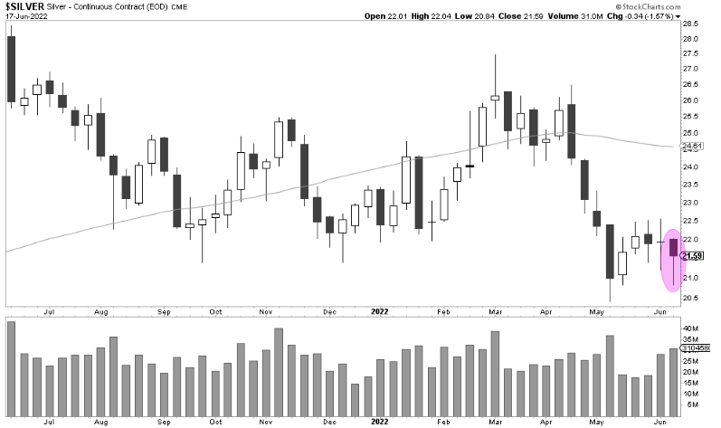 Silver is showing relative strength given the magnitude of the rate increase. The first chart below is a weekly one and clearly indicates how the week prior to the FOMC meeting was a week of indecision in Silver. The candle from the week of the announcement (annotated in pink) clearly indicates how the buyers stepped in with volume.