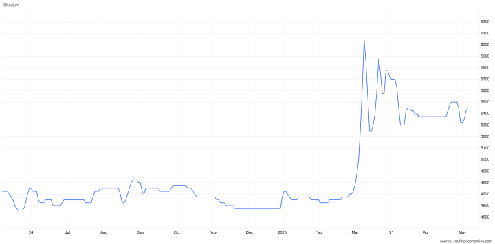 Heraeus forecasts rhodium prices to fluctuate between $4,400 and $5,400 per ounce in 2025, influenced by a small market deficit and potential supply disruptions from major producers like South Africa.