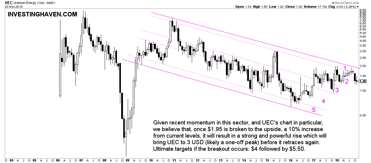 If and once UEC breaks out of its falling channel we may see a quick rise to $4. This may or may not happen in 2019, it will all depend on how uranium’s spot price develops.