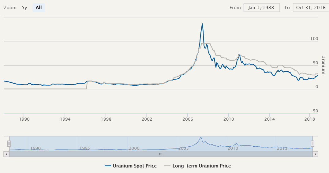 We do not cover the uranium market often, but, admittedly, this forgotten stock market segment looks increasingly more attractive. There is bullish momentum brewing in this sector. The segment of uranium stocks in 2019 might be one of the outperformers. In this uranium stocks forecast for 2019 we will look at the underpinning uranium spot price as well as 3 top uranium stocks.