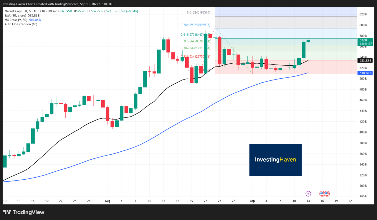 ETH’s protocol hosts the largest developer community for application-layer innovation. As of September 13, 2025, Ethereum’s market capitalization was about $571 billion, ranking it second by market cap and among the top cryptocurrencies over $10 billion market cap.