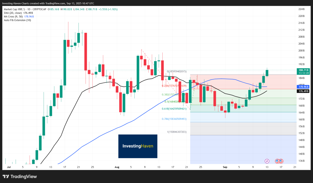 XRP functions as a bridge asset for cross-border liquidity and settlement, with fast finality and low fees. As of September 13, 2025, XRP traded around $3.16 and had an approximate market cap of $188 billion and a circulating supply near 59.61 billion, placing it among the best performing cryptocurrencies.