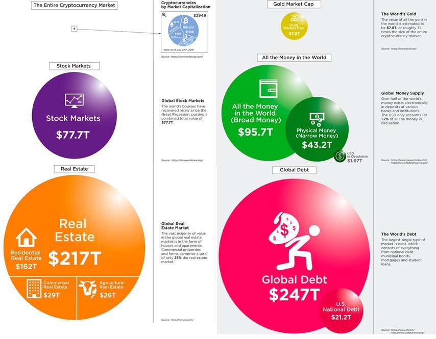 As seen on the first chart cryptocurrencies as a new asset class are so tiny compared to all other asset classes on this world. They are hardly visible (state of the crypto market in Q2 2018). There is so much room for growth.