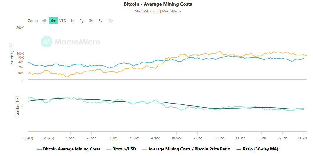 At the time of writing, the average Bitcoin mining cost/Bitcoin price ratio was 0.90, implying miners are in profit by close to $10,000 for every Bitcoin mined.