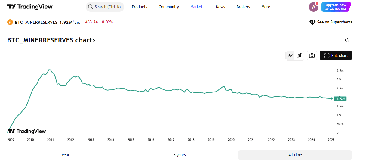 According to data from TradingView, Bitcoin miners only hold less than 2 million BTC today. It is worth noting that Bitcoin miner reserves haven’t fallen below 2 million coins since December 2010.