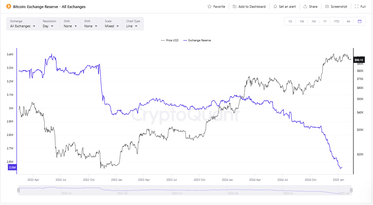 According to crypto data aggregator CryptoQuant, Bitcoin reserves for all the crypto exchanges have fallen to three-year lows, at 2.5 million BTC – to levels last seen in 2022.