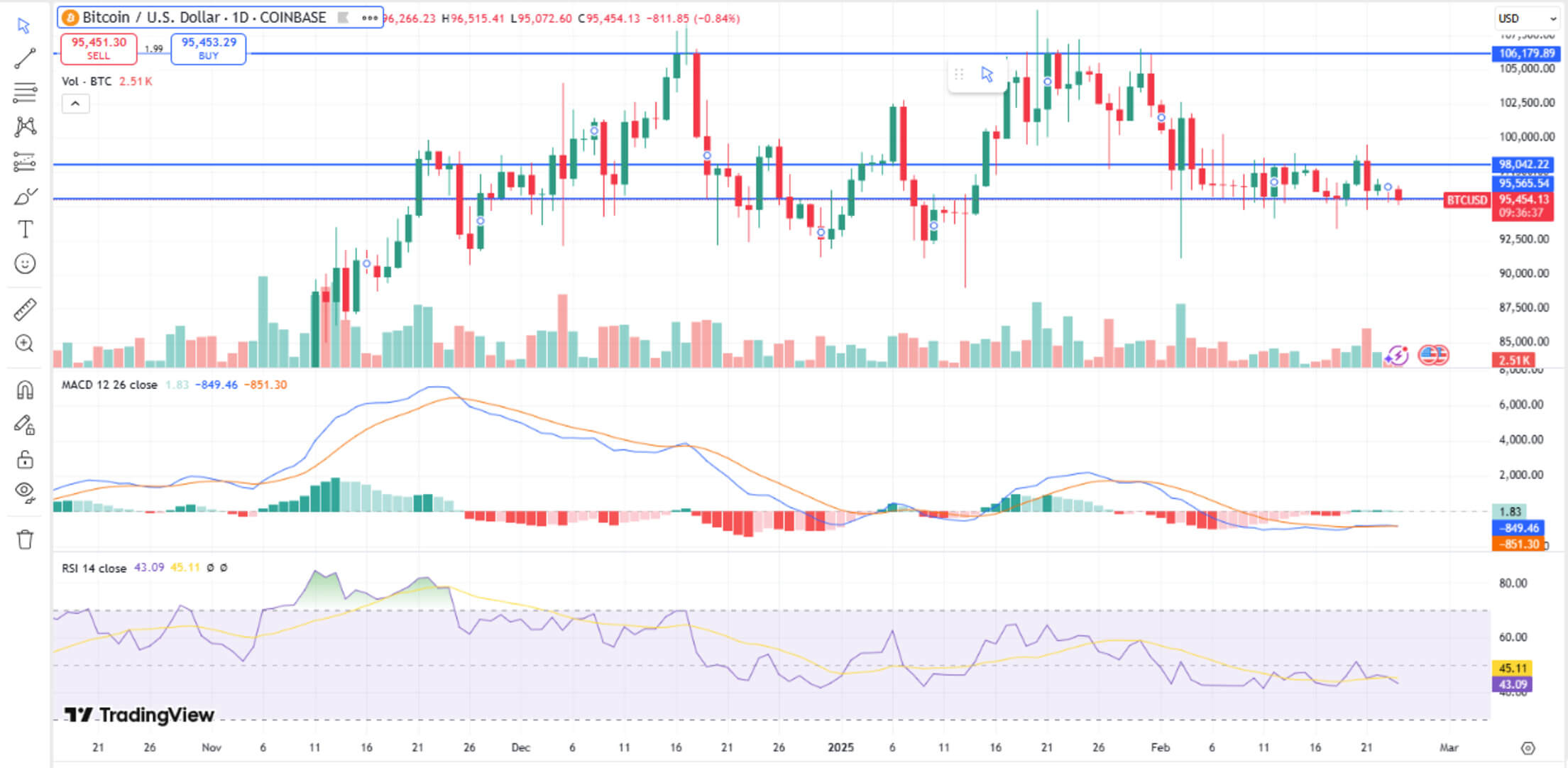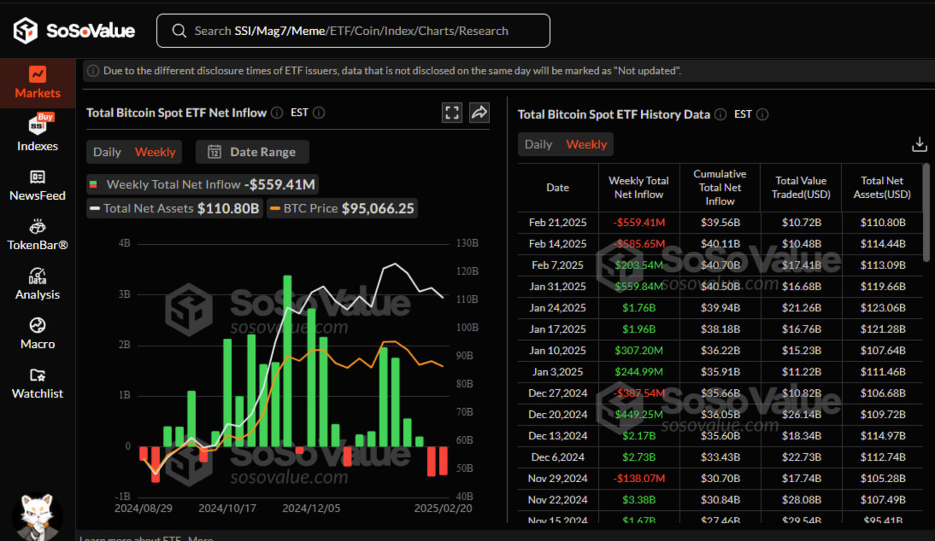 After closing last week on a high and mounting a spirited climb towards $100k, even reaching the high of $99.5k in the Asian market session on Saturday, Feb. 21, Bitcoin has slumped back to the local lows and was trading around $95.8k at press time.