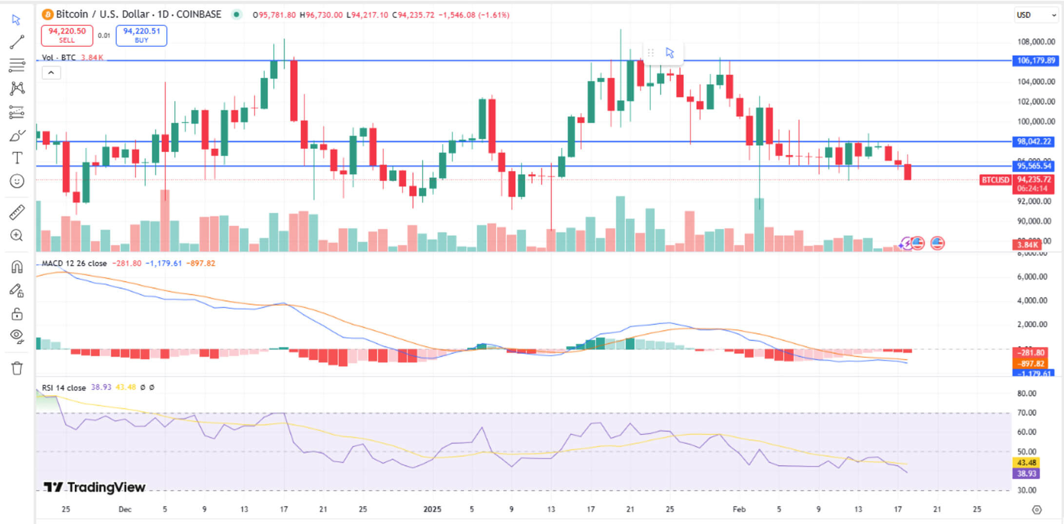Bitcoin’s struggles below $100k stretched into the third week of February 2015 after the third straight day of losses sent it tumbling towards $95,000.
