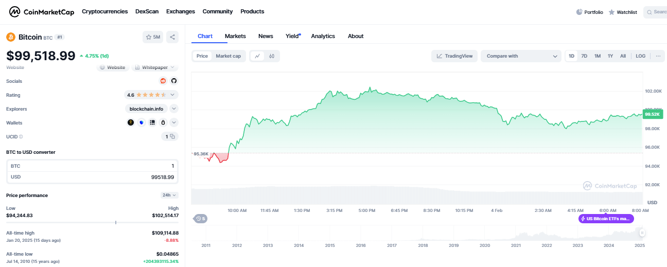 CoinMarketCap: Bitcoin price action on Tuesday, Feb. 4