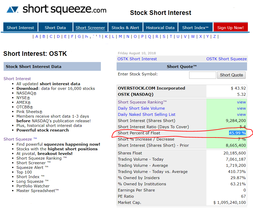 On the one hand the site shortsqueeze.com shows the surrealistic 45.99% short float, see below. According to this overview it seems that Overtock was the 27th most shorted stock at the time of wriring on AMEX, NASDAQ and NYSE.