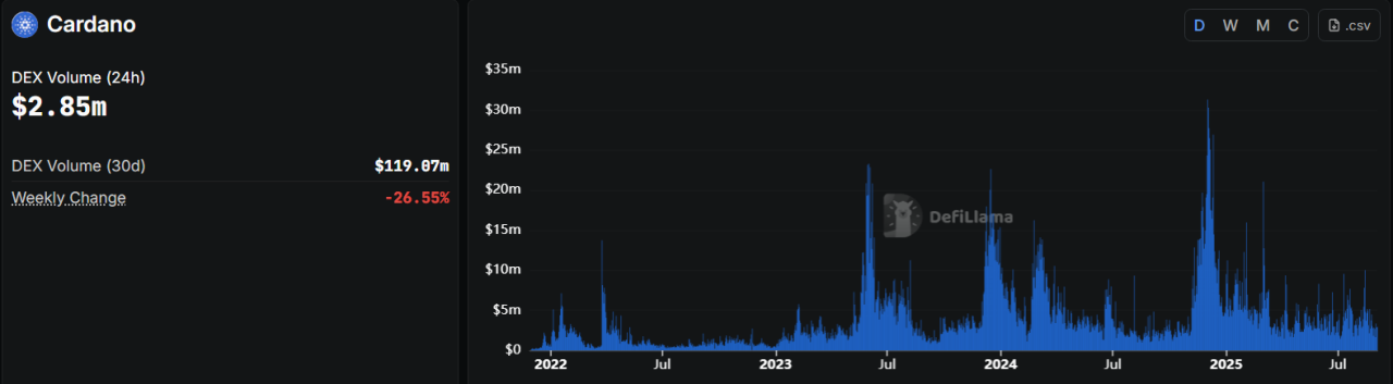 Cardano DEX volume runs at roughly $2.8M over 24h, modest compared with larger L1s, so any sustainable rally needs higher trading throughput.
