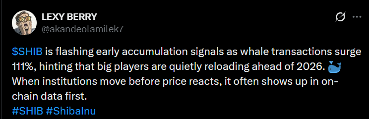A 111% rise in large SHIB transfers means big holders are moving tokens far more actively than before.