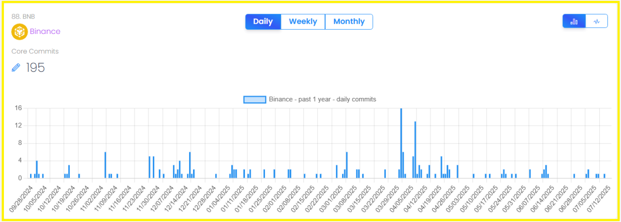 BNB Chain shows active development and a growing set of dApps, which creates long term demand for the native token. Tracking tools record sustained GitHub commits across core repositories and dozens to hundreds of active projects building on the chain.