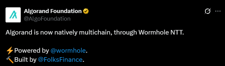 Just days later, on July 1, the Algorand Foundation announced support for Wormhole’s Native Token Transfers (NTT), making Algorand first‑class in Wormhole’s network and enabling native issuance across 40+ chains.