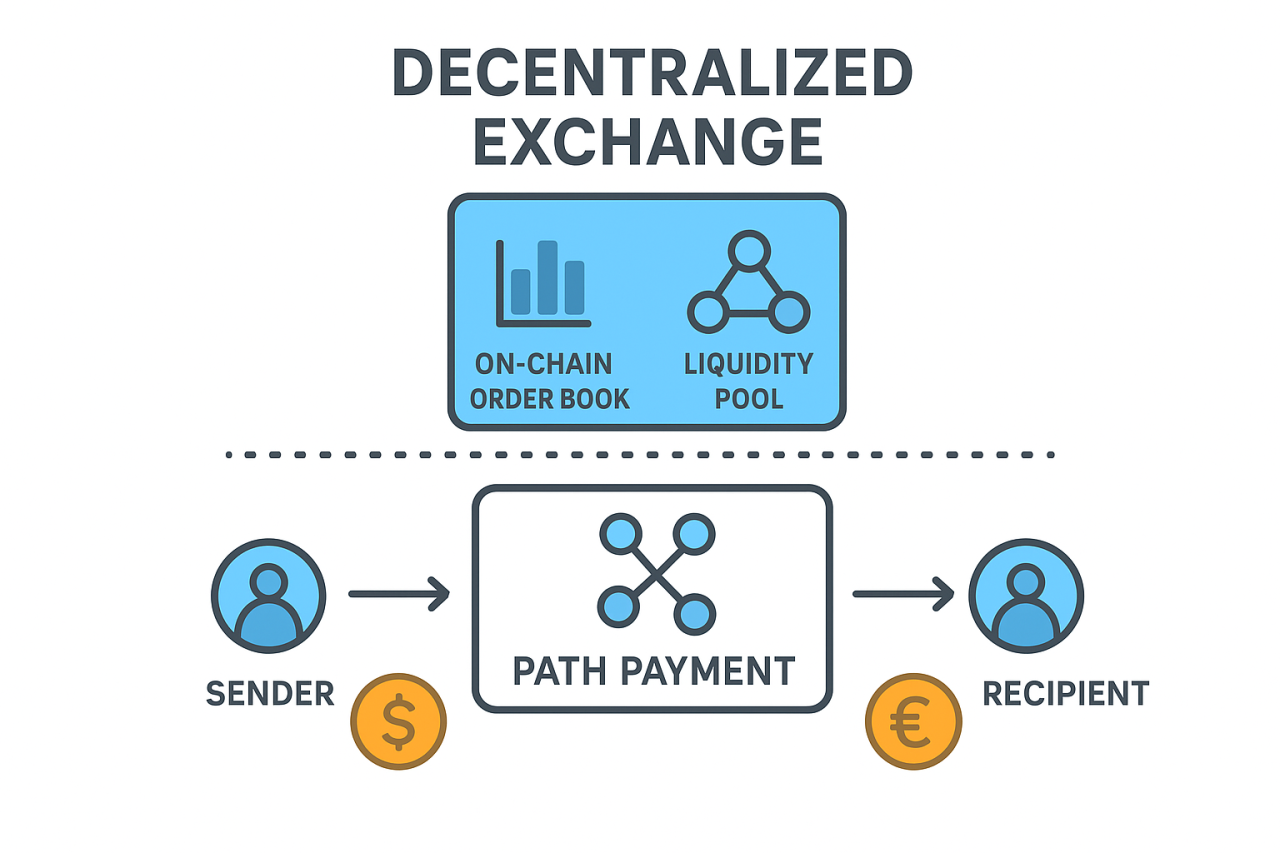 Stellar runs a ledger-level decentralized exchange with on-chain order books and liquidity pools. Path payments let a sender state the asset they want to send and the asset the recipient should receive, and the network finds a route of offers to complete the swap in one transaction.