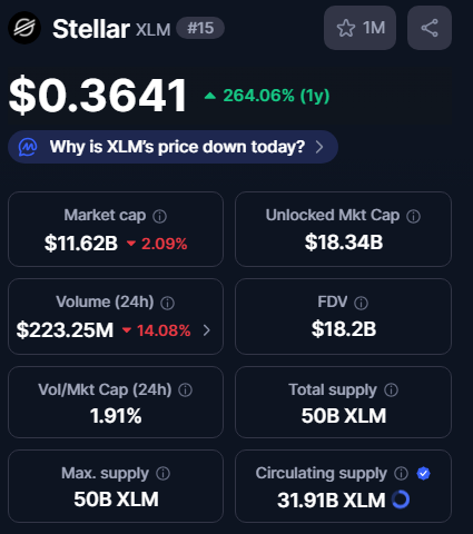 Major trackers list circulating supply at about 31.9 billion XLM, and CoinMarketCap reports a circulating supply of 31,913,419,169 XLM with a market cap around $11.6 billion. XLM ranks among the top 20 tokens by market metrics and appears on major exchanges, which aids liquidity.
