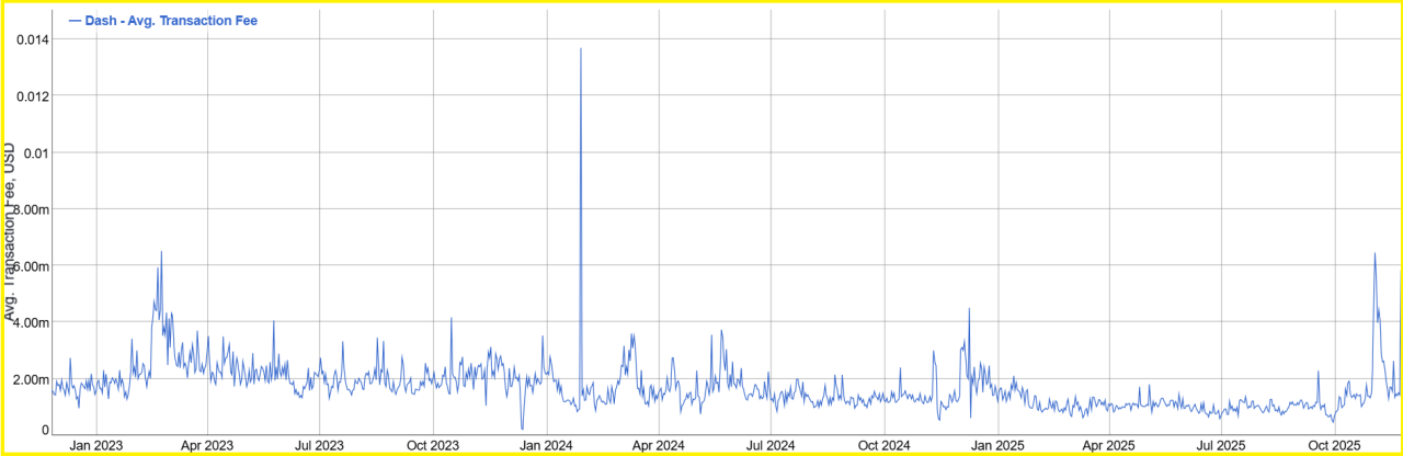 Dash keeps transaction fees extremely low. Historical data shows average fees often sit well below $0.01, usually just a fraction of a cent. This makes Dash ideal for small transactions where every cent matters.