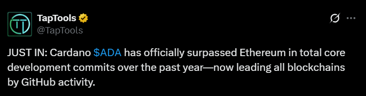 The developer pipeline remains active. For instance, recent reports show Cardano surpassed Ethereum in GitHub commit count, even as smart contract deployments on Cardano exceed 17,000.