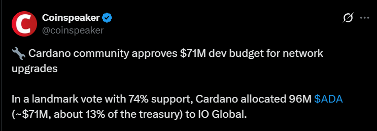 The Cardano community approved a 96M ADA allocation, roughly $71M, for a 12-month upgrade plan, funding core improvements and dApp support.