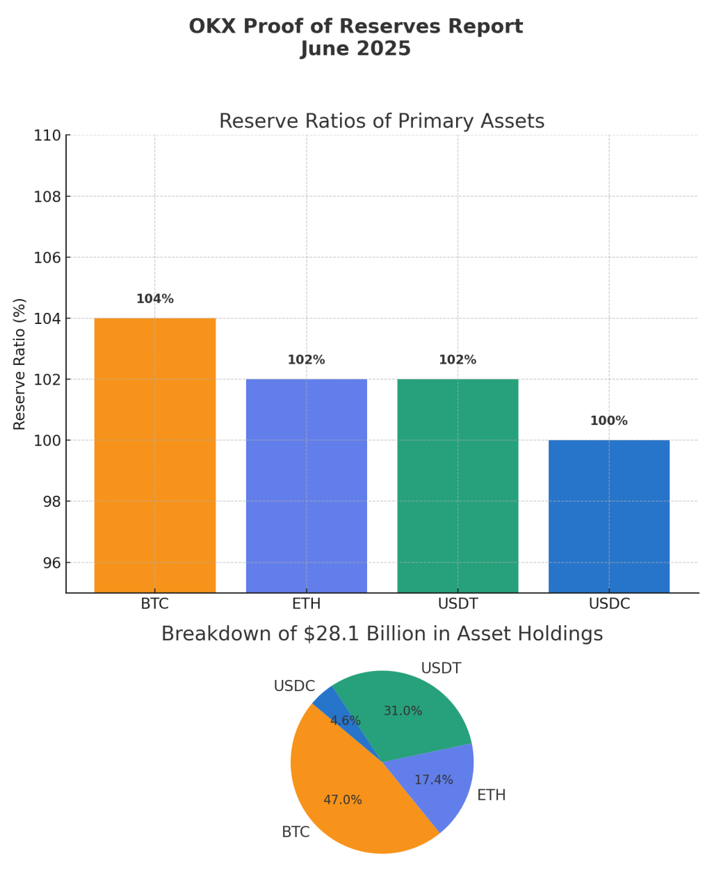 As of February 2025, its 28th consecutive PoR report—audited by Hacken—confirms $28.1 billion in user-backed assets, with 1:1 or greater coverage across 22 major tokens like BTC (104%), ETH (102%), USDT (102%), and USDC (100%).