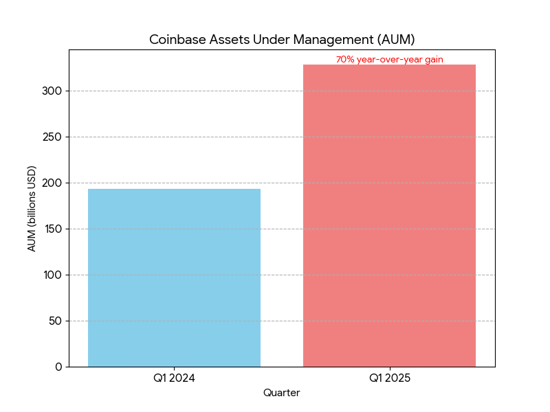In Q1 2025, Coinbase reported $328 billion AUM, up from $193 billion a year earlier—a 70% year-over-year gain.