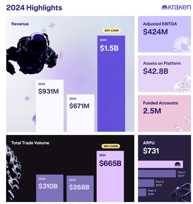 Kraken supports 2.5 million funded accounts with $42.8 billion in client assets and $1.5 billion in revenue in 2024—revenues that grew 128% YoY to $665 billion in trading volume.
