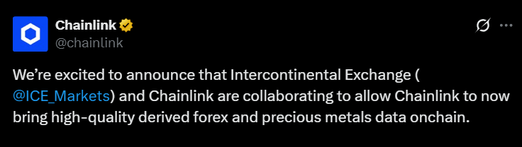 Chainlink now pulls forex and precious metals data from ICE’s Consolidated Feed, sourced from over 300 global venues, into its Data Streams infrastructure. This allows more than 2,000 on-chain applications, banks, and asset managers to access institutional-grade data directly.