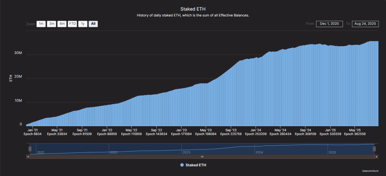 Staking continues to reduce liquid supply. Roughly 35.8M ETH is staked, equal to about 29.6% of supply, with an estimated reward rate near 1.9% today.