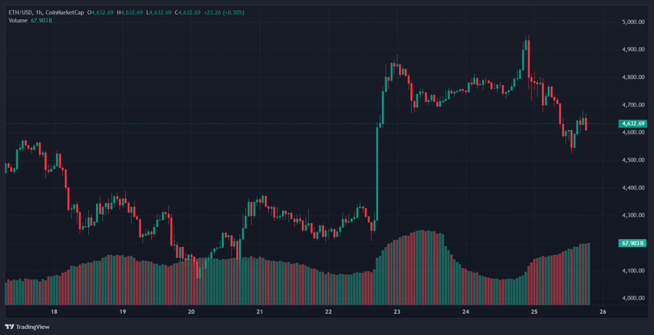 A round-number test around $5,000 is the next hurdle after the $4,945.60 print. Monday trade showed a pullback toward $4,611, highlighting the need to respect liquidity pockets.