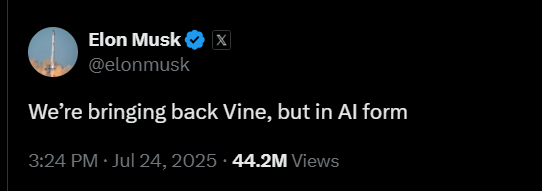 Vine Coin (VINE) exploded into the spotlight after Elon Musk’s July 24 post on X announcing “We’re bringing back Vine, but in AI form.”
