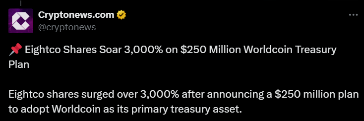 WLD climbed more than 25% on the treasury news and has shown double digit intraday swings in recent weeks, highlighting high short-term volatility.