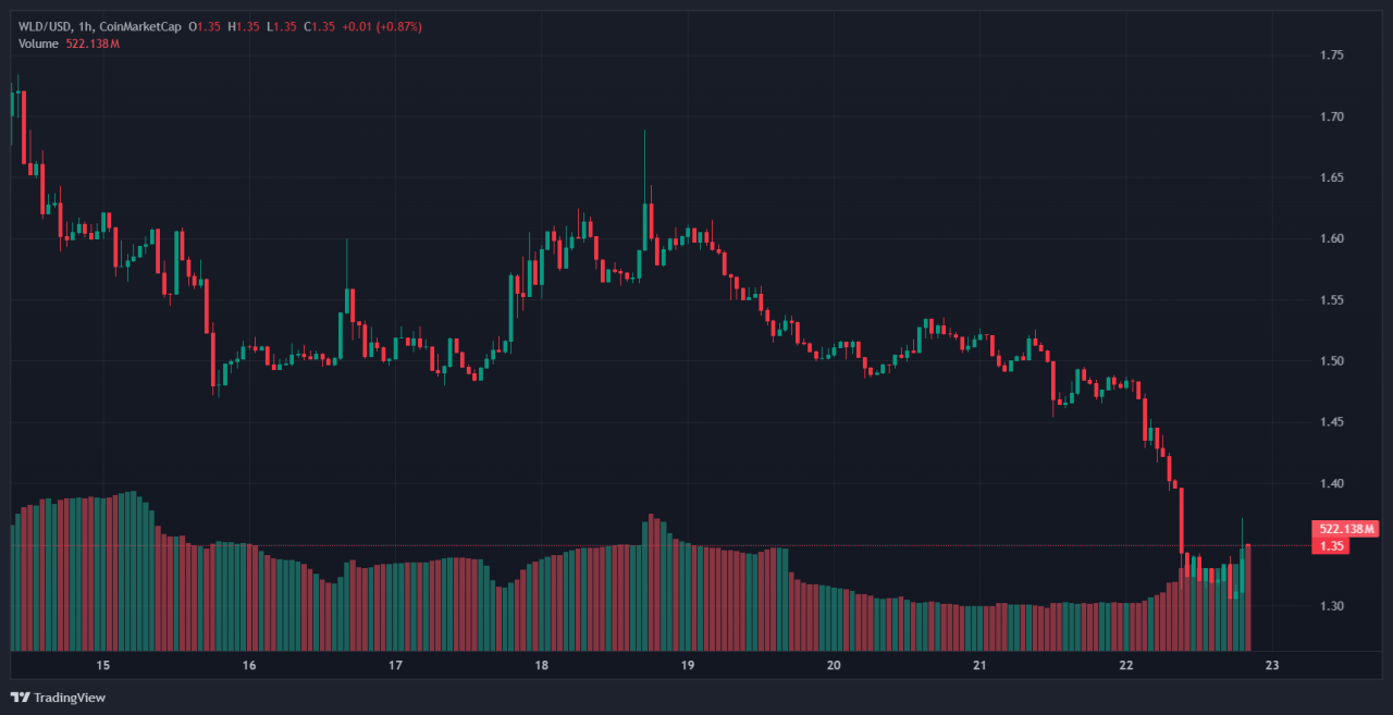 Worldcoin’s WLD sits at about $1.34 with roughly $470 million in 24-hour trading volume, a sign of heavy flows and large intraday moves. The token jumped after reports of a $250 million treasury purchase, which pushed short-term momentum higher.
