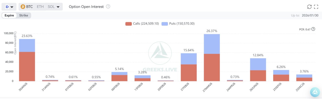 The main upside focus sits at the $100,000 call strike. On the downside, $80,000 to $85,000 marks the area with the largest put exposure.