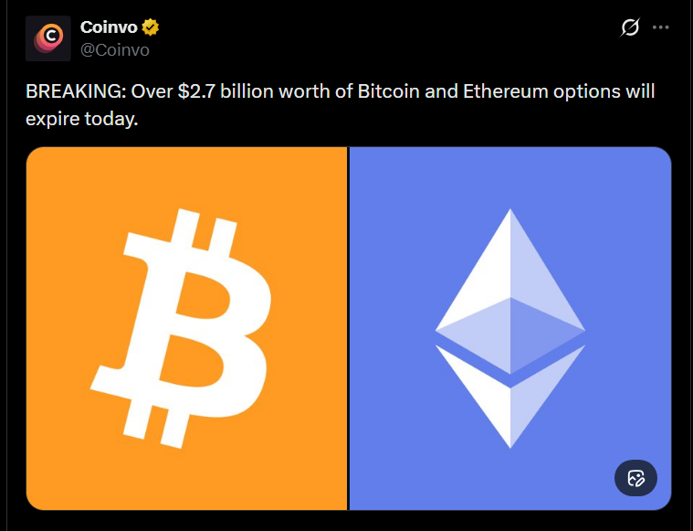 About $2.8–$2.9B in Bitcoin and Ethereum options settle today.