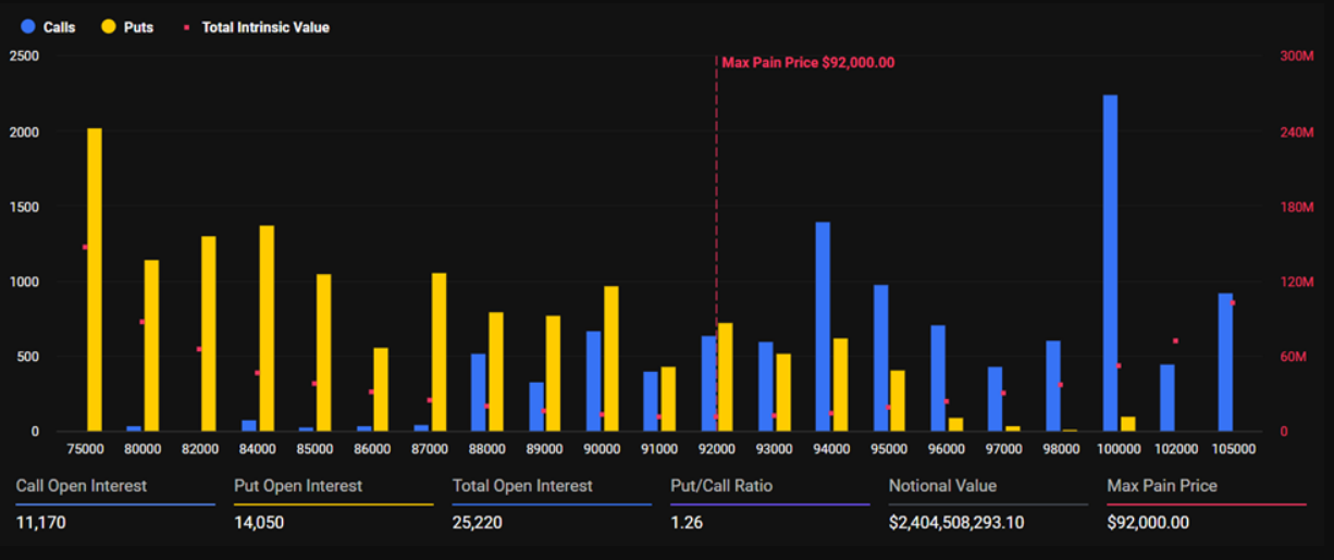 - About $2.4B in Bitcoin options and $430M in Ethereum options expire today.
