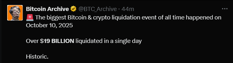 - Roughly $19B in leveraged positions were liquidated during the sell-off.