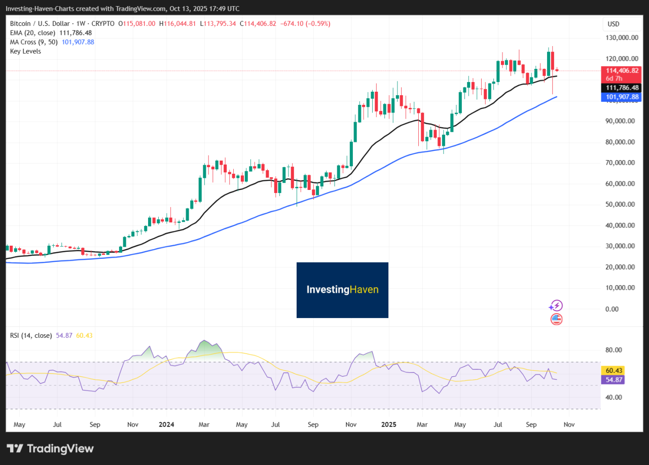 Bitcoin dropped sharply over the weekend before bouncing about 12%, climbing back to around $115k. The quick recovery suggests traders may be stepping back in after heavy losses cleared out excess leverage.