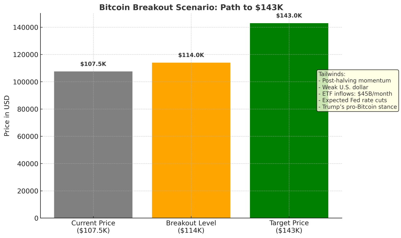 He notes that if Bitcoin climbs 6% higher to clear that ceiling, it could trigger a 25% surge to $143K, supported by tailwinds including post-halving momentum, U.S. dollar weakness, robust ETF inflows ($45B/month), expected Fed rate cuts, and pro-Bitcoin policy under a Trump administration.