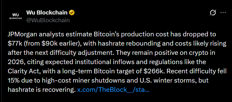 JPMorgan’s latest update puts bitcoin’s estimated production cost at $77,000, down from about $90,000 in earlier models. Bitcoin currently trades around $66,000, leaving many miners operating below breakeven.