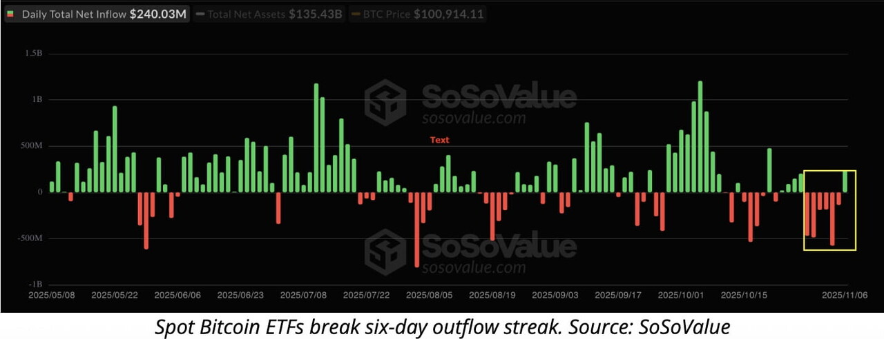 The first week of November brought renewed confidence, with U.S. spot Bitcoin ETFs recording $240 million in inflows, their first positive day in nearly a week.