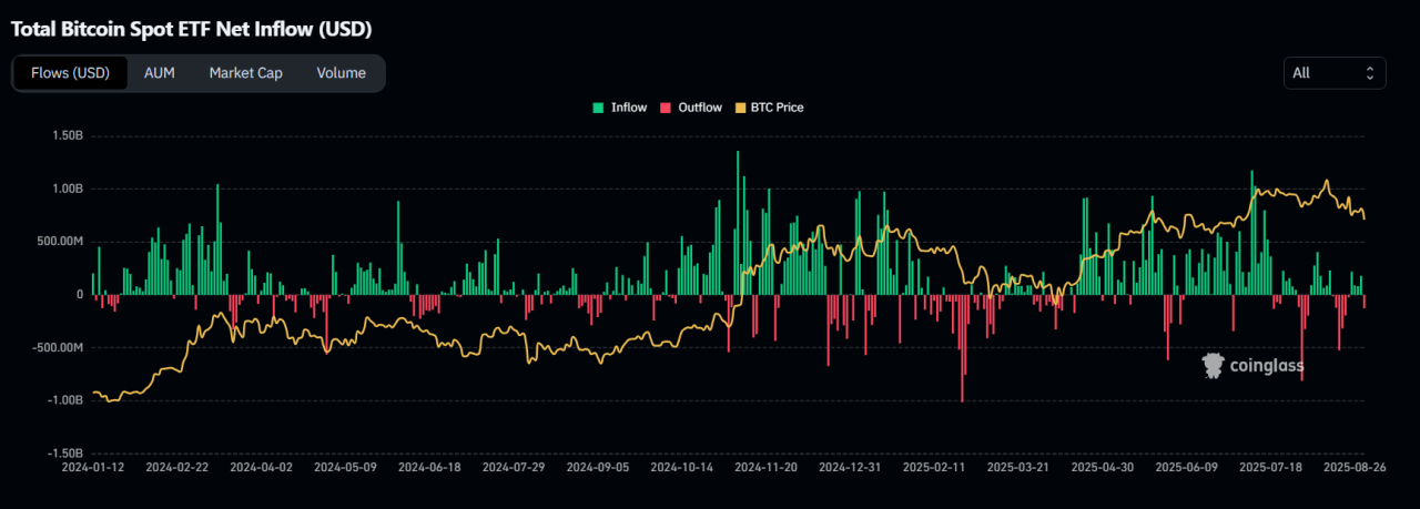 Bitcoin institutional flows look mixed, removing a clear tailwind for bulls. Data show about $751M of net outflows from U.S. Bitcoin spot ETFs in August while a recent weekly print recorded roughly $126.7M of redemptions, trimming AUM around $140B.