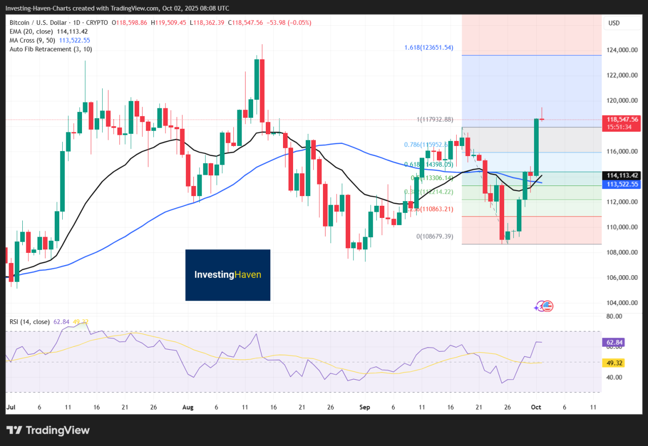 Bitcoin climbed to about $118,000, Ethereum rose above $4,300, and XRP traded around $2.97 after the U.S. government shutdown began.