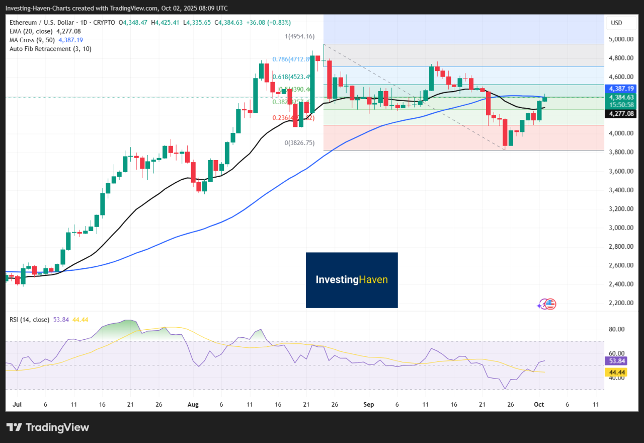 Ethereum gained 4% and hovered above $4,300.